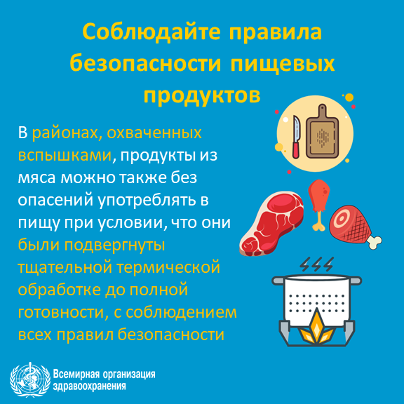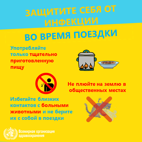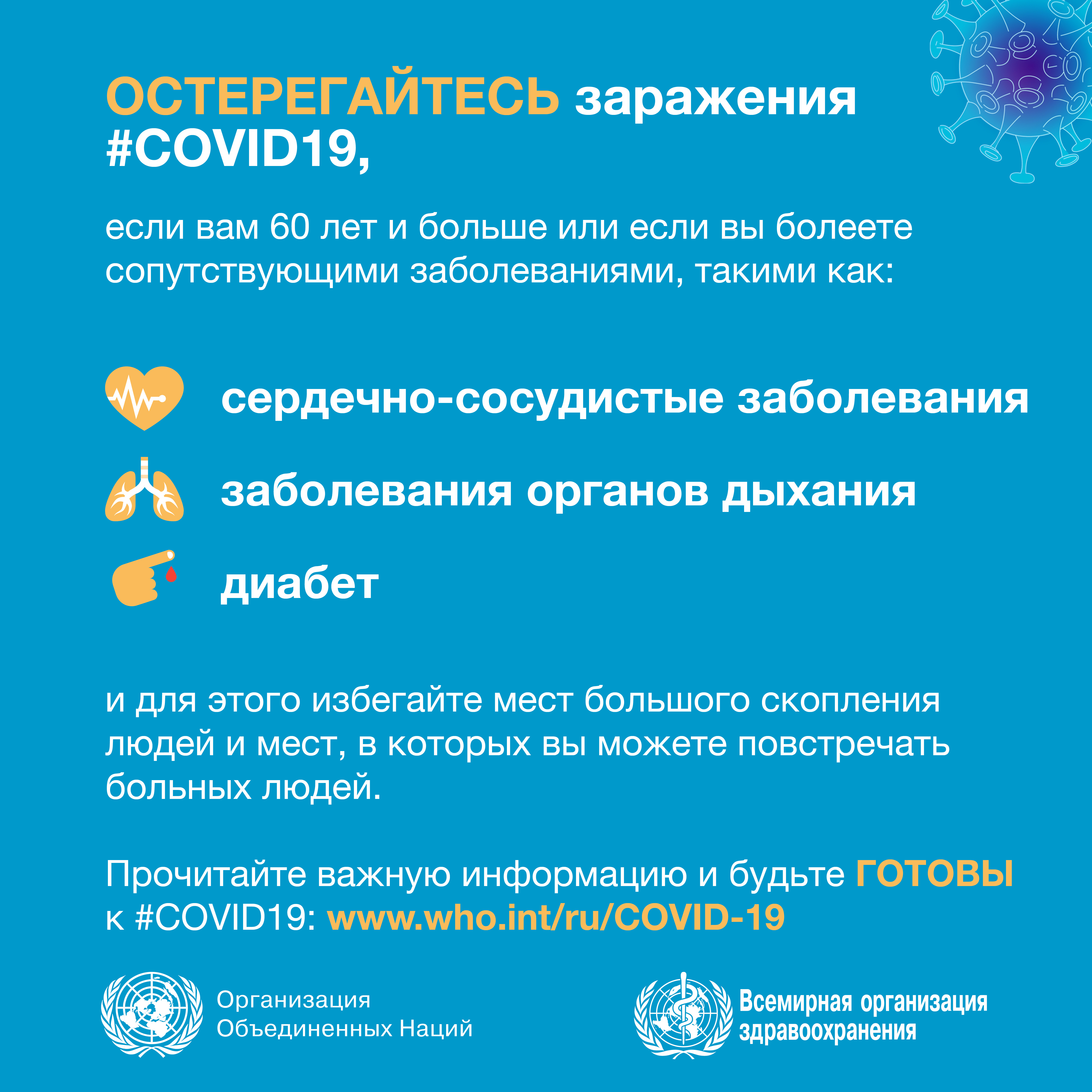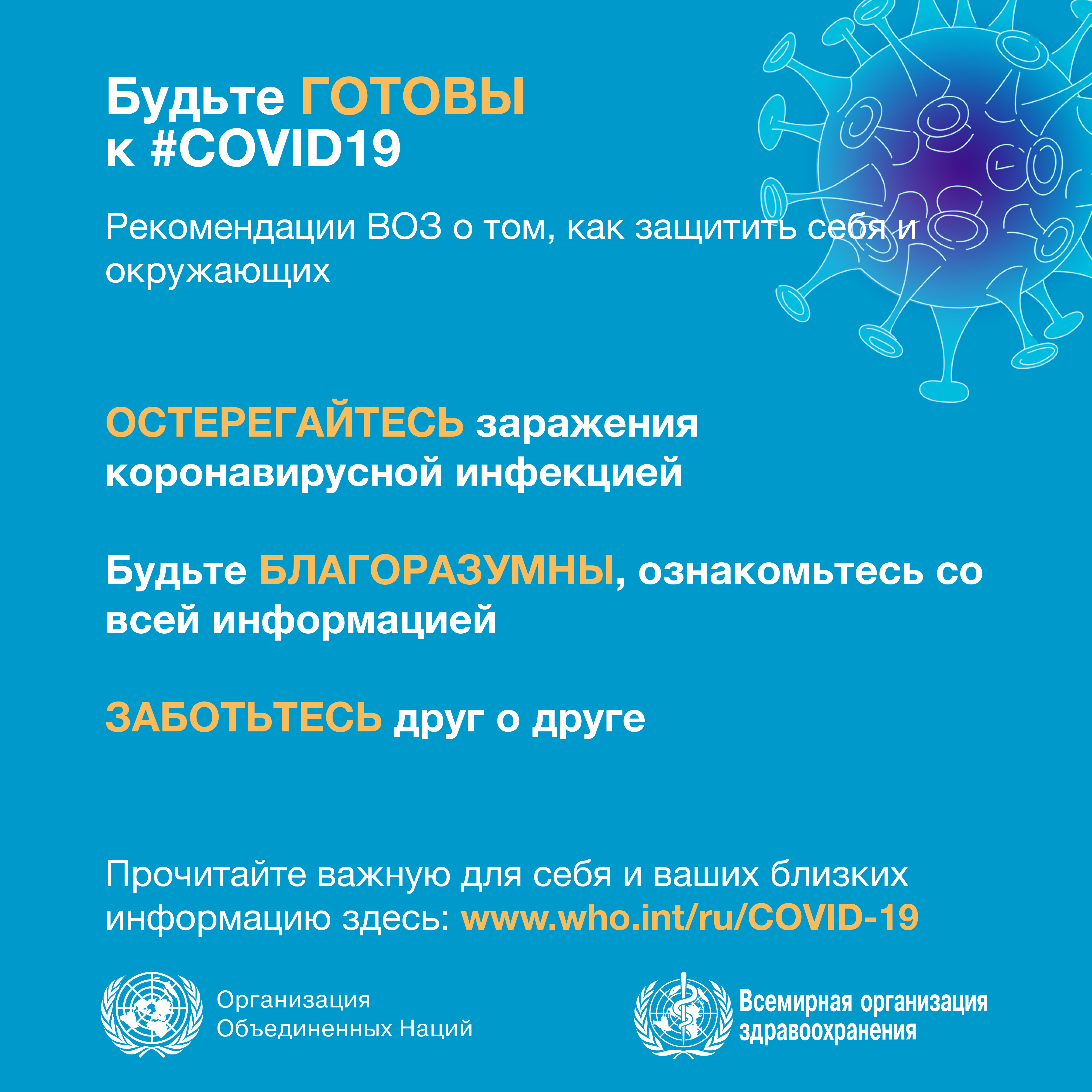 Следите за новейшей информацией о вспышке COVID-19, которую можно найти на веб-сайте ВОЗ, а также получить от органов общественного здравоохранения вашей страны и населенного пункта. Наибольшее число случаев COVID-19 по-прежнему выявлено в Китае, тогда как в других странах отмечаются вспышки локального характера. В большинстве случаев заболевание характеризуется легким течением и заканчивается выздоровлением, хотя встречаются осложнения. Защитить свое здоровье и здоровье окружающих можно, соблюдая следующие правила: