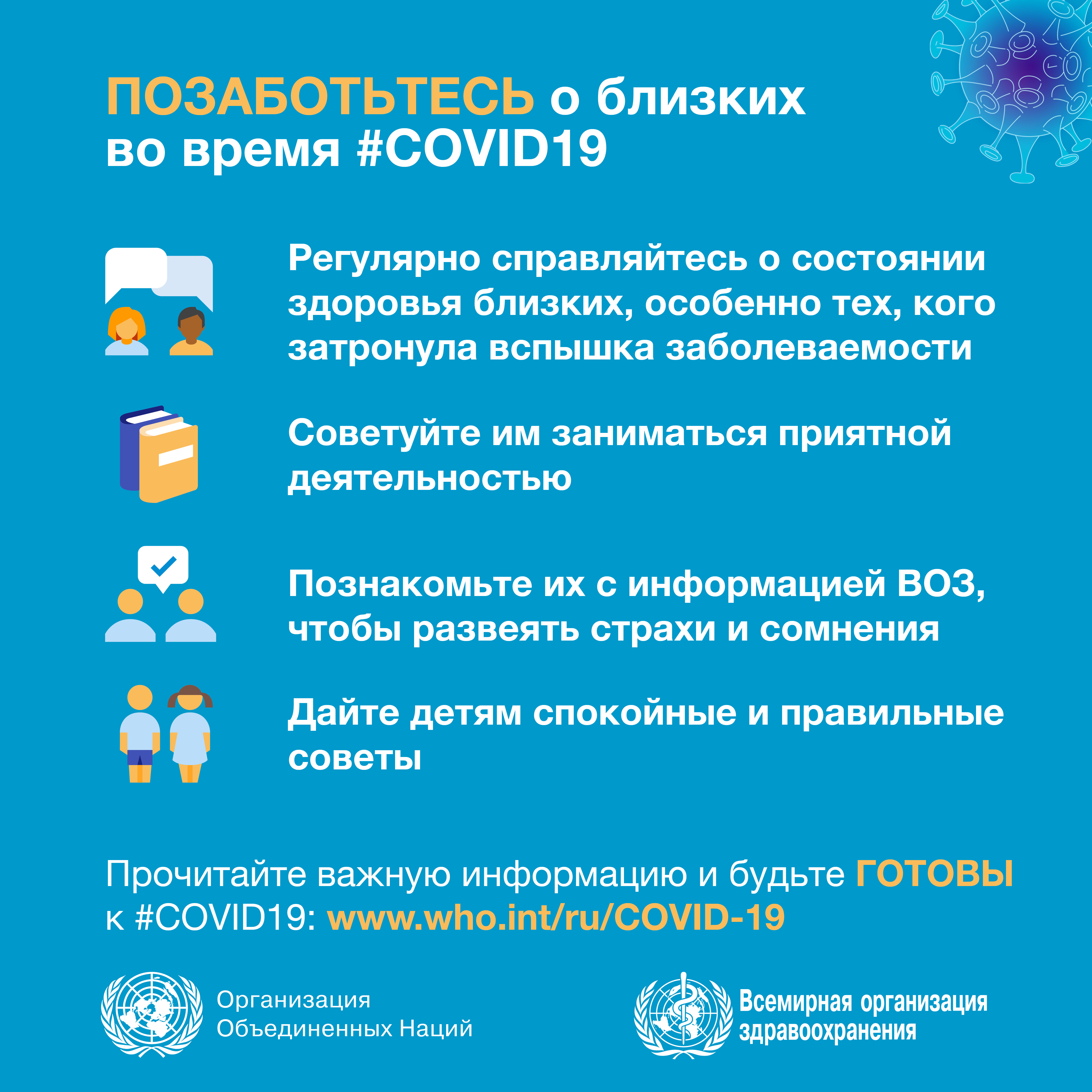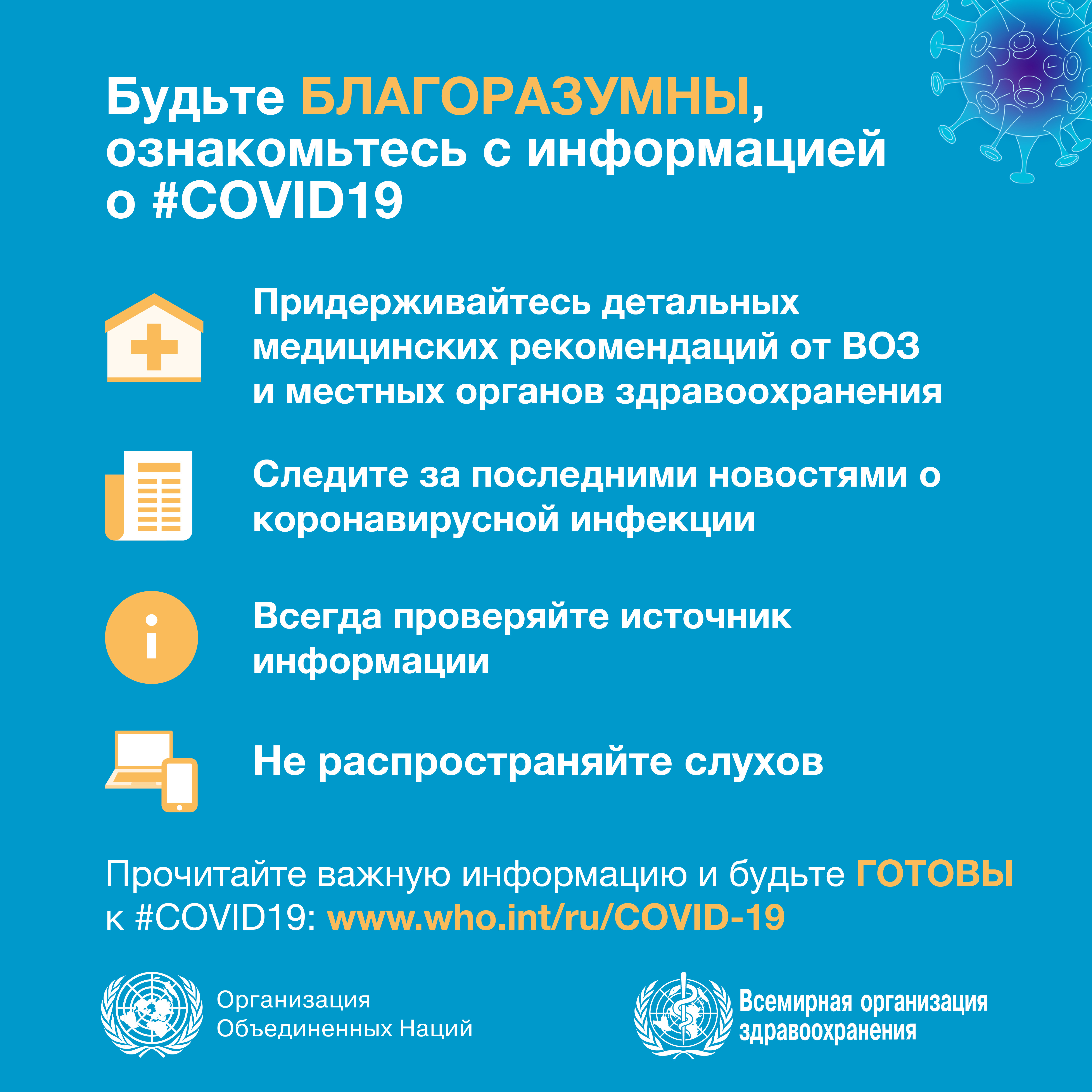 Следите за новейшей информацией и выполняйте рекомендации медицинских специалистов Следите за новейшей информацией о COVID-19. Выполняйте рекомендации специалистов, центральных и местных органов общественного здравоохранения, а также организации, в которой вы работаете, по защите себя и окружающих от COVID-19.