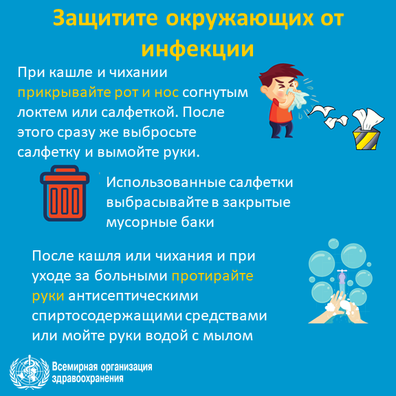 Соблюдайте правила респираторной гигиены При кашле и чихании прикрывайте рот и нос салфеткой или сгибом локтя; сразу выкидывайте салфетку в контейнер для мусора с крышкой и обрабатывайте руки спиртосодержащим антисептиком или мойте их водой с мылом.